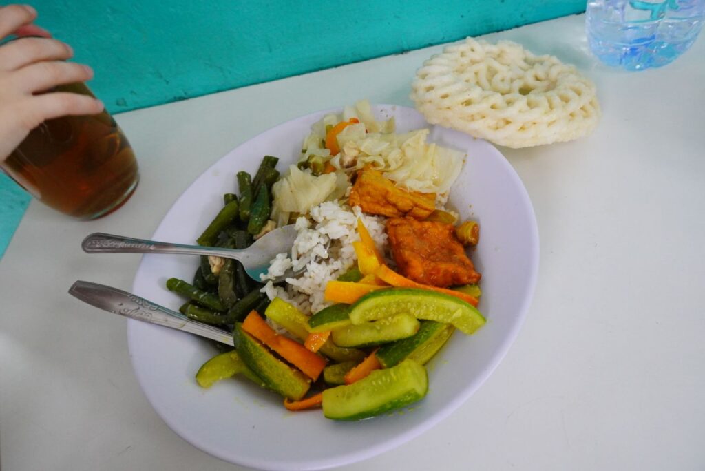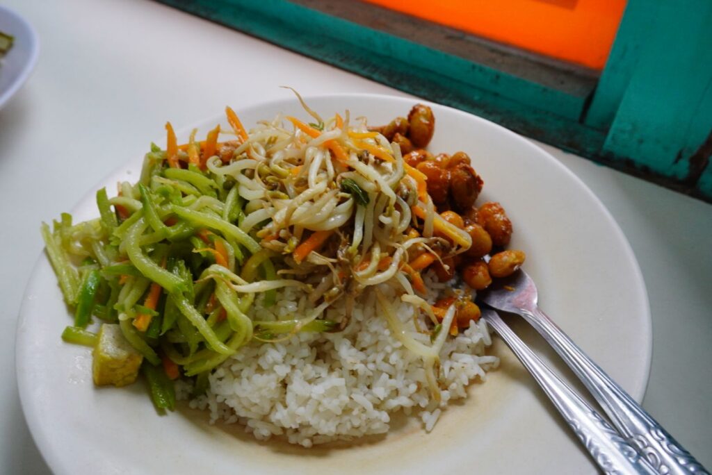A poważnie udało nam się znaleźć pyszną i tanią “dziurę w ścianie”. Co wyjątkowe: czysta, z mnóstwem warzywnych opcji ( także tofu i tempeh). Wszystkim smakowało! I to za 55k rupii 🙂