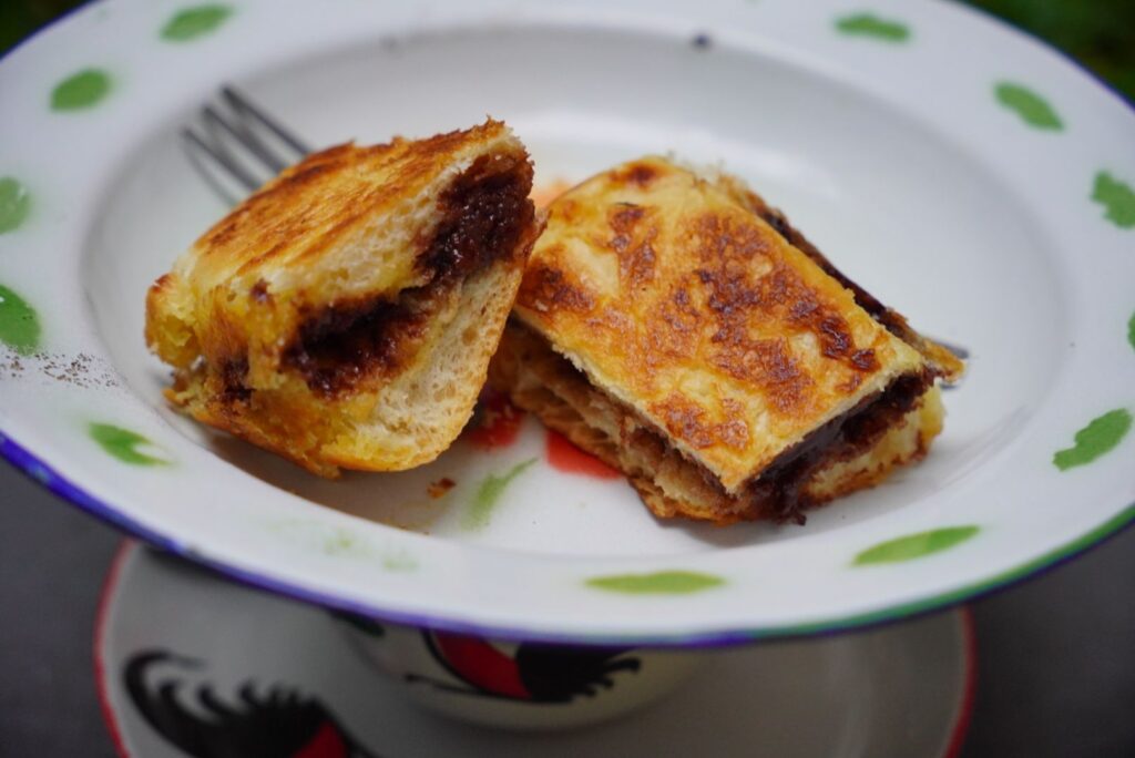 A poniżej lokalna wersja tego przysmaku. Kupiliśmy ja sobie do kawy – jest to smażony chleb tostowy z czekoladą. Podobne przysmaki jedliśmy 15 lat temu na Sumatrze … 😅